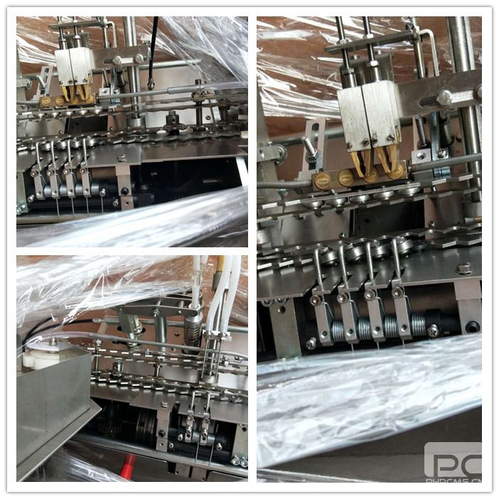 当安瓿从进瓶转盘被送到定位齿板上时,安瓿的瓶身应该刚好接触到装在下定位齿板上的调节规,而安瓿的瓶颈刚好接触到装在上定位齿板的调节杆调节杆在固定齿板上下移动。5cc时向下降,10cc时向上升。“F”调节杆,调节至瓶颈不向下倾倒,并顺利通过,调节杆“E”,调节到边输送安瓿,能正常运转。